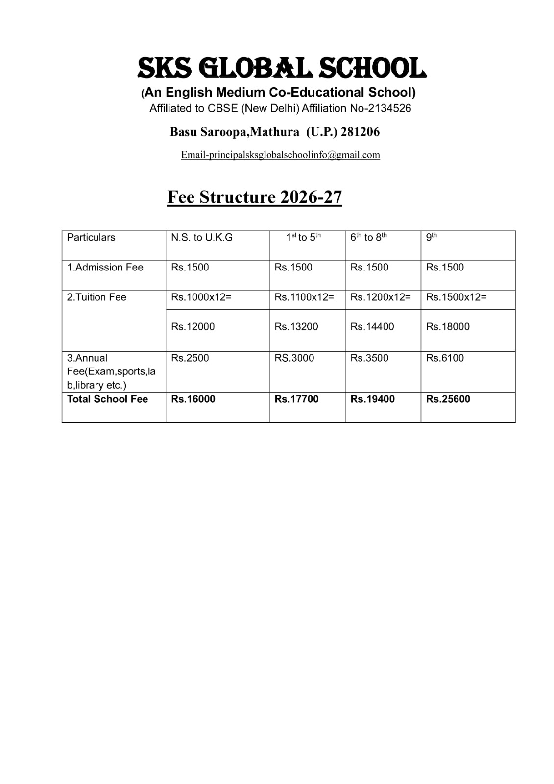 SKS Global School, Basu Sarupa, Raya, Mathura offers a range of features and facilities designed to provide a comprehensive educational experience. Here are some of the key offerings: